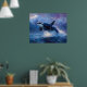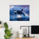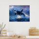 A dynamic orca leaps from the ocean with water splashing around its body, set against snow-covered mountains and a dramatic purple-blue sky—capturing the power and beauty of marine life in motion.