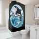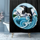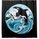 An orca jumping out of the ocean with water all around. Mountains and blue sky all around the killer whale all drawn in an art nouveau tattoo style.