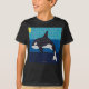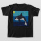 Artistic depiction of an orca whale in the ocean, illuminated by a vibrant sun in the background.