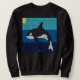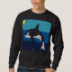 Artistic depiction of an orca whale in the ocean, illuminated by a vibrant sun in the background.