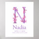 Pretty hand-painted in watercolor monogram letter N with pink wild orchids twisted around the purple letter N name and meaning poster. Ideal for a personalized gift for a girl who has a name beginning with N. This example reads Nadia Giver of hope. Tender, athletic and well-spoken or you can customize the text with your own name and meaning words if required. Ideal as a special birthday or celebration gift. If you need help with your own personalized name please contact me. © Capital letter N typographical whimsical orchid watercolor painting by Sarah Trett for www.mylittleeden.com