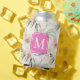This can cooler design features tropical orchid flowers on a cream coloured background. In the centre is a pink notched square frame with a monogram initial.