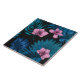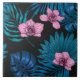 Orchids and palm leaves, pink and blue on black ceramic tile