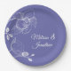 Elegant wedding paper plates featuring a beautiful and delicate white orchids line drawing design on one side, over a contemporary periwinkle purple background. Easily edit the template fields to add the bride and groom names in a classy white script.