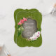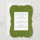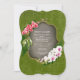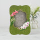 This wedding invitation design features a romantic, nature-inspired aesthetic with a bold green frame, reminiscent of a mossy garden setting. The top left of the frame is adorned with elegant pink orchids, while the bottom right displays vibrant white orchids. These floral elements frame the central portion of the invitation, which has a soft, textured grey background.