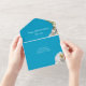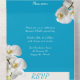 Orchid birthday party invitation for her in aqua blue. A special all-in-one party invitation with detachable RSVP card has realistic white orchids over pretty blue paper. The white wording is a modern script font. The reply card has a panel in white so name and reply is easy to read. Orchids are white stems with yellow centres and decorate the inside and outside of the cards. Three address templates have been provided for the recipient, return address and reply card address.