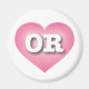 This magnet features a pink heart with a white-washed centre containing the bold, white, upper case letters OR, the official abbreviation for Oregon, the beaver state .