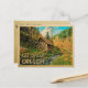 Vintage Oregon Save The Date postcard in fun retro mid-century style. It features a rustic woody nature landscape with a wood cabin and water wheel mill, and a pretty creek stream with fall leaves for an autumn or end of summer feel. This Oregon Save The Date postcard will be perfect for a country wedding or nature and camping wedding.