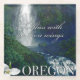 A digital painting of a waterfall found along the switchback trail of Multnomah Falls in Oregon's Columbia River Gorge Scenic Area. The white number in the top corner is the year that Oregon became a state. The white lettering in the centre of the painting, "She flies with her own wings", is the state motto. At the bottom of the painting is a white trillium flower next to Oregon in white lettering. A simple dark blue border finishes the painting. Image Copyright ©2023 Kimberly J Tilley.