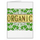 Organic a green slogan for gardeners, cooks and Earth Day celebrations, in decorated capital letters against a background of acorns and oak leaves, surrounded by scrolling leaves.