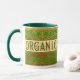 Organic a green slogan for gardeners, cooks and Earth Day celebrations, in decorated capital letters against a background of acorns and oak leaves, surrounded by scrolling leaves.