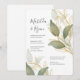 Gorgeous watercolor leaves paired with gold colour leaves headline this modern wedding invitation.