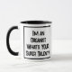 Funny slogan on a Two Tone Coffee mug that says "I'm an Organist. What's YOUR super talent?". Two Tone Coffee Mug for an Organist. Black and white bold text.