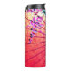 A pink and red parasol decorated with painted flowers and little blue birds. Seems to glow from within.