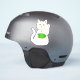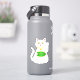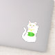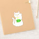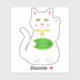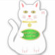 This awesome sticker features a graphic design image of a lucky oriental white waving cat. The cat has beautiful gold eyes and is wearing a gold medallion on the collar around its neck. The cat has pink ears and whiskers. This cute little kitty is holding a golden token with green jade inlay and a message in golden text that says "Good Luck".