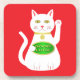 This awesome cork coaster set features a graphic design image of a lucky oriental white waving cat. The cat has beautiful gold eyes and is wearing a gold medallion on the collar around its neck. The cat has pink ears and whiskers. This cute little kitty is holding a golden token with green jade inlay and a message in golden text that says "Good Luck".