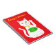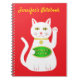 This awesome notebook features a graphic design image of a lucky oriental white waving cat. The cat has beautiful gold eyes and is wearing a gold medallion on the collar around its neck. The cat has pink ears and whiskers. This cute little kitty is holding a golden token with green jade inlay and a message in golden text that says "Good Luck". There is custom text so you can personalise this notebook.