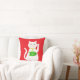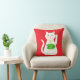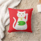 This awesome pillow features a graphic design image of a lucky oriental white waving cat. The cat has beautiful gold eyes and is wearing a gold medallion on the collar around its neck. The cat has pink ears and whiskers. This cute little kitty is holding a golden token with green jade inlay and a message in golden text that says "Good Luck". The design is patterned across the back of the pillow.