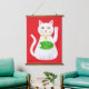 This awesome wood topped wall tapestry features a graphic design image of a lucky oriental white waving cat. The cat has beautiful gold eyes and is wearing a gold medallion on the collar around its neck. The cat has pink ears and whiskers. This cute little kitty is holding a golden token with green jade inlay and a message in golden text that says "Good Luck".