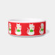 This awesome cat bowl features a graphic design image of a lucky oriental white waving cat. The cat has beautiful gold eyes and is wearing a gold medallion on the collar around its neck. The cat has pink ears and whiskers. This cute little kitty is holding a golden token with green jade inlay and a message in golden text that says "Good Luck".