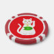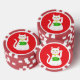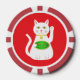 This awesome set of poker chips features a graphic design image of a lucky oriental white waving cat. The cat has beautiful gold eyes and is wearing a gold medallion on the collar around its neck. The cat has pink ears and whiskers. This cute little kitty is holding a golden token with green jade inlay and a message in golden text that says "Good Luck".