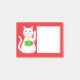 This awesome post it note pad features a graphic design image of a lucky oriental white waving cat. The cat has beautiful gold eyes and is wearing a gold medallion on the collar around its neck. The cat has pink ears and whiskers. This cute little kitty is holding a golden token with green jade inlay and a message in golden text that says "Good Luck".