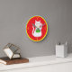 This awesome wall clock features a graphic design image of a lucky oriental white waving cat. The cat has beautiful gold eyes and is wearing a gold medallion on the collar around its neck. The cat has pink ears and whiskers. This cute little kitty is holding a golden token with green jade inlay and a message in golden text that says "Good Luck".