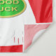 This awesome tapestry features a graphic design image of a lucky oriental white waving cat. The cat has beautiful gold eyes and is wearing a gold medallion on the collar around its neck. The cat has pink ears and whiskers. This cute little kitty is holding a golden token with green jade inlay and a message in golden text that says "Good Luck".
