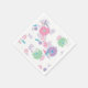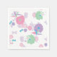 A set of paper napkins with a Japanese design of origami paper cranes and flowers in pink, purple, green, and blue, against a paper texture background.