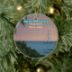 A circular ceramic ornament with an image that will make the seafarer in you yearn to be at the helm of this catamaran traversing the blue ocean waters beneath a soft orange and yellow sky at sunset. A palm tree and naupaka bushes provide the perfect framing accents for this idyllic vacation image.