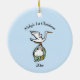 Pink side has a stork carrying a baby on pink with the babies name and 1st Christmas, The other side is blue for the baby boy with a stork carrying a baby along with babies name and 1st Christmas.