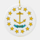 Crafted with attention to detail, this ornament pays homage to Rhode Island's rich history and maritime heritage. The design proudly showcases the state's flag, featuring a gold anchor centred on a white field surrounded by thirteen gold stars representing the original colonies and the state's motto "HOPE." The anchor symbolises hope and steadfastness, reflecting Rhode Island's role as the Ocean State.