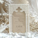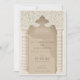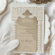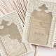 This stunning wedding invitation draws inspiration from the rich tradition of Islamic architecture, showcasing a palatial arch design, elegantly flanked by chevron-patterned columns in a nuanced palette of cream, taupe, and ecru. The intricate lace-like detailing atop the arch, rendered in shades of sand and ivory, adds a layer of sophistication, invoking the timeless beauty of intricate plasterwork found in historic mosques. This invitation is the epitome of elegance and heritage, extending a gracious invitation to your guests with its blend of cultural artistry and modern design elements, setting the stage for a wedding that celebrates love and tradition.