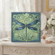 This elegant ceramic tile features a beautifully detailed Art Nouveau–inspired dragonfly, rendered in rich shades of blue with gold-accented outlines. Intricate swirling leaves and graceful botanical scrollwork surround the central motif, creating a sophisticated, ornamental look. The soft teal background gently fades toward a deep border, giving the artwork depth and a refined framed effect.