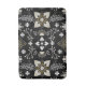 Ornate black and white floral pattern with gold accents. Central symmetrical flower surrounded by leaf motifs and intricate branches. Elegant, decorative design.