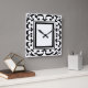 This elegant, decorative black and white clock features an ornate abstract curlicue pattern surrounding a central square.