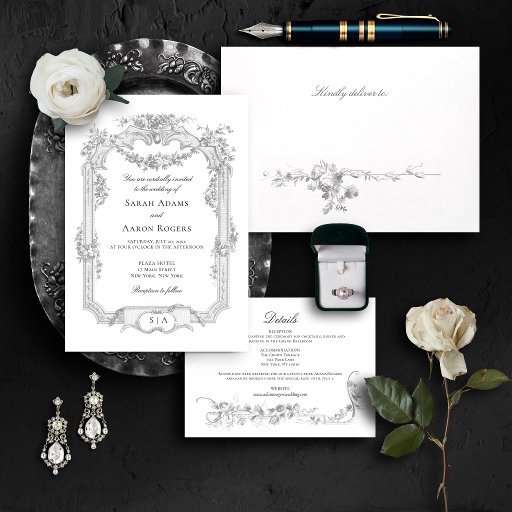 Enter the romantic era of 18th century France with this elegant etched light gray floral design featuring garlands of roses and acanthus leaves surrounding a neoclassic style sculpted frame. Included are complementary floral graphics and editable text fields.