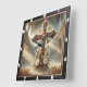 This stunning square wall clock features an elaborately ornate, jewelled cross adorned with white roses and red berries, radiating divine light. It stands majestically within a grand gothic cathedral, bathed in ethereal light rays filtering through majestic arches, creating a profound and spiritual atmosphere.