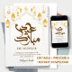 Luxury white and gold Eid greeting card featuring a decorative arch, intricate geometric patterns, and hanging golden lanterns. A timeless and sophisticated choice.