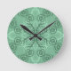 Wall clock with a detailed and intricate pattern of leaves and swirls in green and white. Ornate symmetrical design in cool soothing greens.