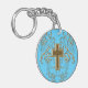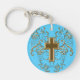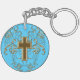 Ornate Scrolls & Cross Keychain, Light Blue & Gold Key Ring