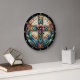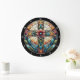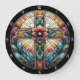 This exquisite wall clock features a highly detailed stained glass design of a cross, intricately adorned with lush floral and leaf patterns. The vibrant array of colours, including soft pinks, blues, and oranges, creates a captivating and serene display, making it a beautiful addition to any spiritual or decorative setting. Edit colour of the clocks numbers in the Design tool to your favored colours.