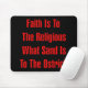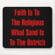 Looking for a quick and easy way to explain your objection to religion? Big, red letters proclaim that "Faith is to the religious what sand is to the ostrich." Good way to let others know you don't need any imaginary friends telling you what to think.