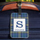 Luggage tag with the O'Sullivan clan tartan, a classic plaid pattern in bright royal blue, sky blue, and green, with red, white, and yellow highlights. Personalise with your initial and name on a light coloured plate for easy legibility.