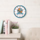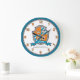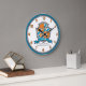 Knights style shield monogram letter O art name simple numbered wall clock perfect for a boys bedroom or playroom in shades of orange, blue white and grey. Personalise with your child's own name and name meaning for a personalised touch to your child's bedroom or nursery, this example is for names with the letter O. Currently reads Othni My time, my hour. Methodical, strong and clever. Ideal for a gift to a new baby boy, for a christening, baby naming or baby shower gift. Unique shield drawing, dog face, crown and graphic star art, name research, wording and design by Sarah Trett. www.sarahtrett.com for www.mylittleeden.com