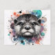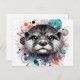 This postcard features watercolor otter art with multicolor circular splashes. The otter is facing forward with a direct, almost daring gaze at viewer. Teal, pink, peach, gray and blue are some of the colors in the framing splashes. Great for otter lovers!