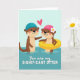 This card shows two cartoon otters floating in calm, two-tone aqua water under a pale aqua sky, sharing a sweet, friendly moment 🥰. The left otter wears a blue swim cap and leans in with a gentle paw extended, eyes turned toward its companion as if mid-hello. Across from it, the right otter wears a pink swim cap with a small white-and-yellow flower and relaxes in a bright yellow inner tube, smiling back with rosy cheeks ❤️. A pink heart hovers between them, just above their heads, tying their warm eye contact together. The illustration uses crisp outlines and soft shading so the characters pop against the simple water-and-sky background. Below the scene, the phrase “You are my SIGNIFICANT OTTER” sits centered near the bottom in pink lettering, easy to spot against the lighter background. The water shifts from lighter aqua near the top to a deeper blue below, framing the otters in the middle.