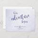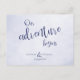 This simply designed typographic style wedding save the date postcard features the phrase "Our adventure begins" in a whimsical dark blue calligraphy style script on a mottled blue and white background - your custom text is matching dark blue - by katz_d_zynes