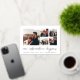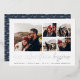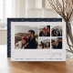 A modern and exciting save the date card for the adventure-minded couple, this clean and simple design features five square photos in a grid collage layout, with "our adventure begins" beneath in silver foil hand lettered script. Personalise with your announcement, names, and additional details along the bottom, and add more (like your wedding website) to the back.