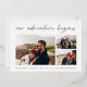 A modern and exciting save the date card for the adventure-minded couple, this clean and simple design features three horizontal or landscape orientated photos in a grid collage layout, with "our adventure begins" above in silver foil hand lettered script. Personalise with your announcement, names, and additional details along the bottom, and add more (like your wedding website) to the back.